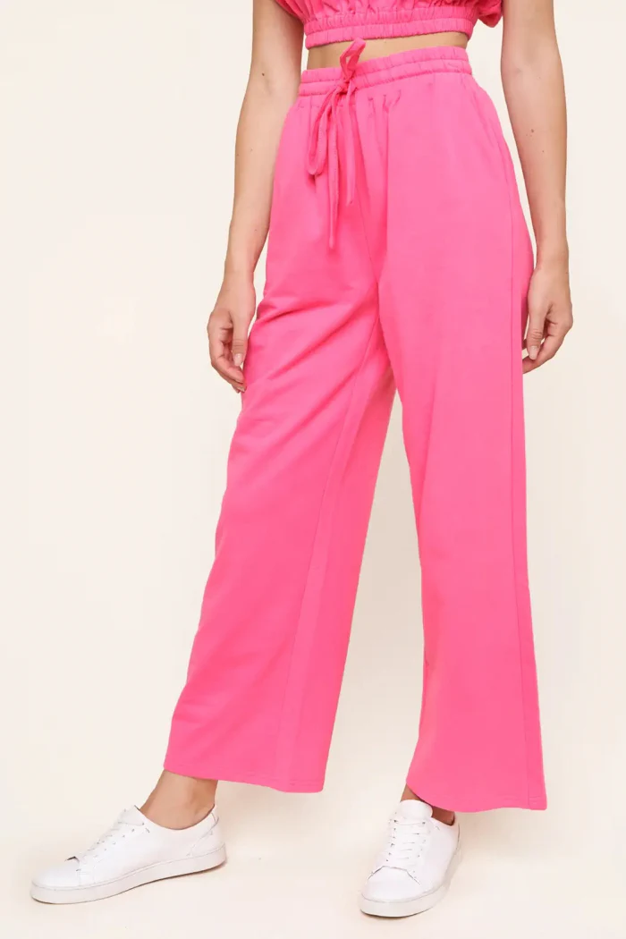 Lounging around in these wide leg pants. Made of the french terry knit, these pants feature an elastic waistband with a drawstring and side pockets. Pair it any of the basics knit tops and throw on a pair of sneakers.