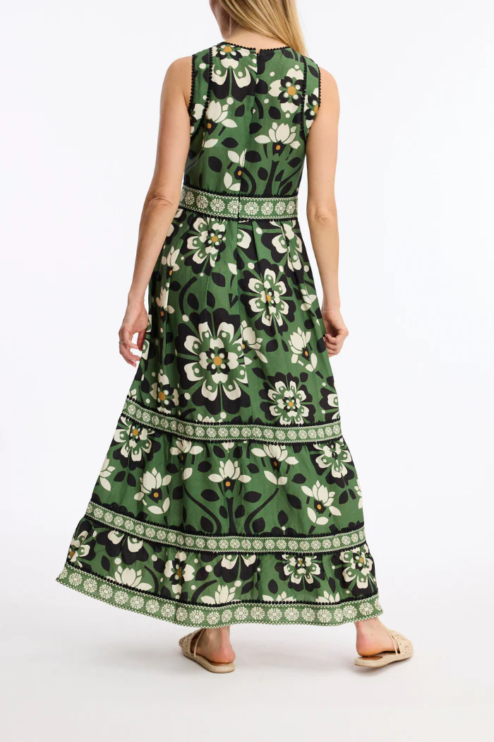 This dress brings effortless sophistication with bohemian-luxe, 70s-inspired editorial energy. Crafted from a crisp woven fabric in rich forest green with a bold large-scale retro floral print in cream, black, and mustard gold, it has a vibrant, graphic quality that is both striking and timelessly elegant. The crew neckline with delicate black crochet trim creates a refined, artisanal frame. A vertical crochet trim panel runs down the center front bodice, adding a beautiful architectural detail that draws the eye. A wide crochet trim band defines the waist with a polished, structured precision. The full, sweeping tiered A-line maxi skirt features two horizontal crochet trim bands creating distinct, beautifully proportioned tiers. A crochet trim hem completes the head-to-toe artisanal finish. The sleeveless silhouette keeps it perfectly suited for warm-weather dressing. This is the dress that makes a lasting impression at a garden party, outdoor wedding, or summer afternoon out.
