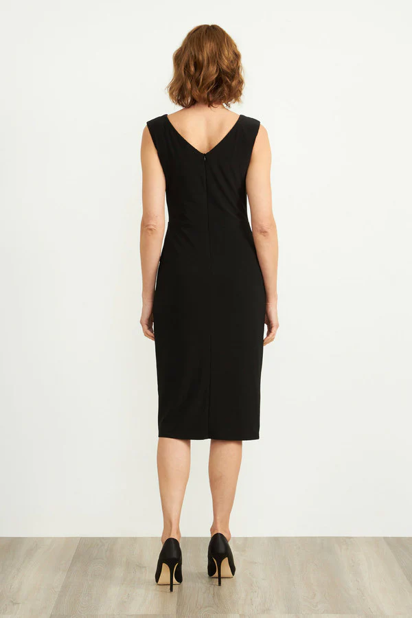 Cocktail hour just wouldn’t be complete without this little Joseph Ribkoff black dress! This sleeveless beauty is elegant simplicity, embodied. The excess fabric is gathered and cinched at the side, held together with a shimmering rhinestone brooch. This creates a soft, draping effect which creates motion with every sway.