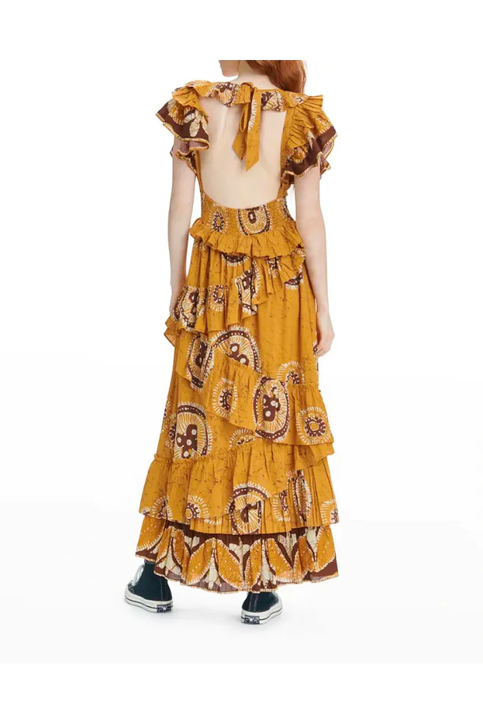 This dress brings romantic sophistication with effortless, bohemian elegance. Crafted from cotton in a stunning Gigi Gold print, it has a soft, breathable quality with beautiful movement. The V-neckline creates a flattering, elegant frame, while the short ruffle sleeves add feminine, playful charm. The open back with self-ties adds a flirtatious, unexpected detail and graceful finishing. The smocked back waist provides a comfortable, figure-flattering fit. Tiered asymmetric ruffles cascade throughout, creating dramatic movement and dimensional texture. The fit-and-flare silhouette is universally flattering, flowing beautifully from the fitted bodice. The full-length hem creates elegant, sweeping coverage. This stunning piece transitions effortlessly from garden parties to resort getaways and special celebrations.