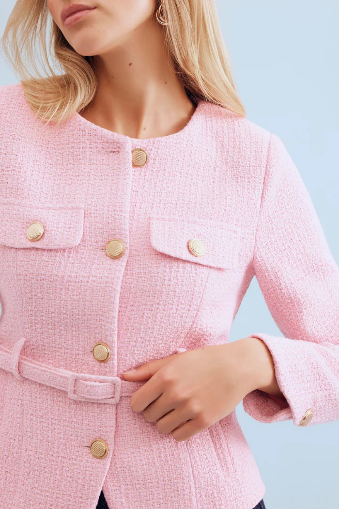Design Details | Collarless round neckline, single-breasted button-front, large gold coin buttons, two flap chest pockets with gold buttons, long sleeves with gold button cuffs, matching self-fabric belt with gold buckle, raw fringe hem, soft blush pink tweed