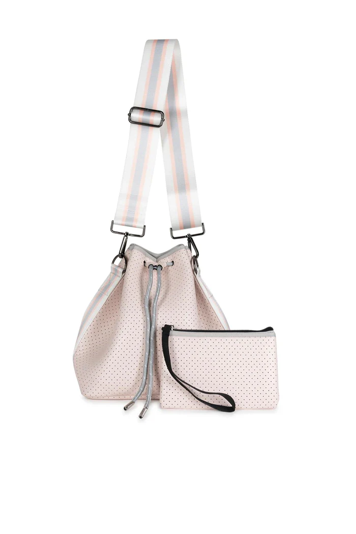 - Neoprene bucket bag with side stripe detailing and additional wristlet pouch